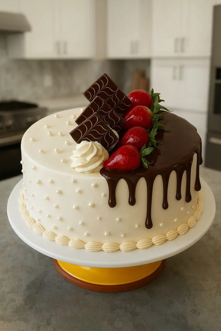 A beautifully crafted cake combining smooth vanilla layers with luscious chocolate ganache, crowned with fresh strawberries and artistic chocolate pieces—perfect for celebrations that call for both style and flavor.